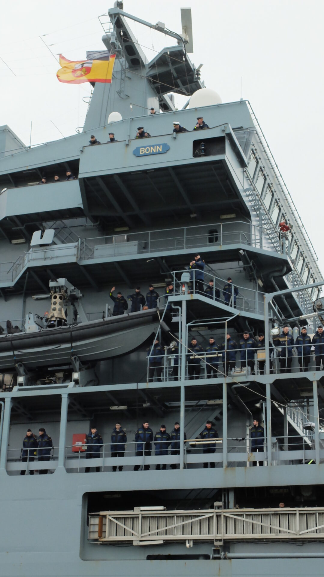 Derweil warteten die Angehörigen der Besatzung des Einsatzgruppenversorgers "Bonn" auf die Rückkehr ihrer Lieben am Freitag, den 05. April. Die "Bonn" ist am 15. Januar dieses Jahres unter dem Kommando von Fregattenkapitän Eike Deußen (50) aus Wilhelmshaven ausgelaufen, um am NATO Einsatzverband der Very High Readiness Joint Task Force Maritime (VJTF M) teilzunehmen. Die 183-köpfige Besatzung der "Bonn" legte ca. 11.000 Seemeilen (ca. 20.372km) in knapp drei Monaten zurück.