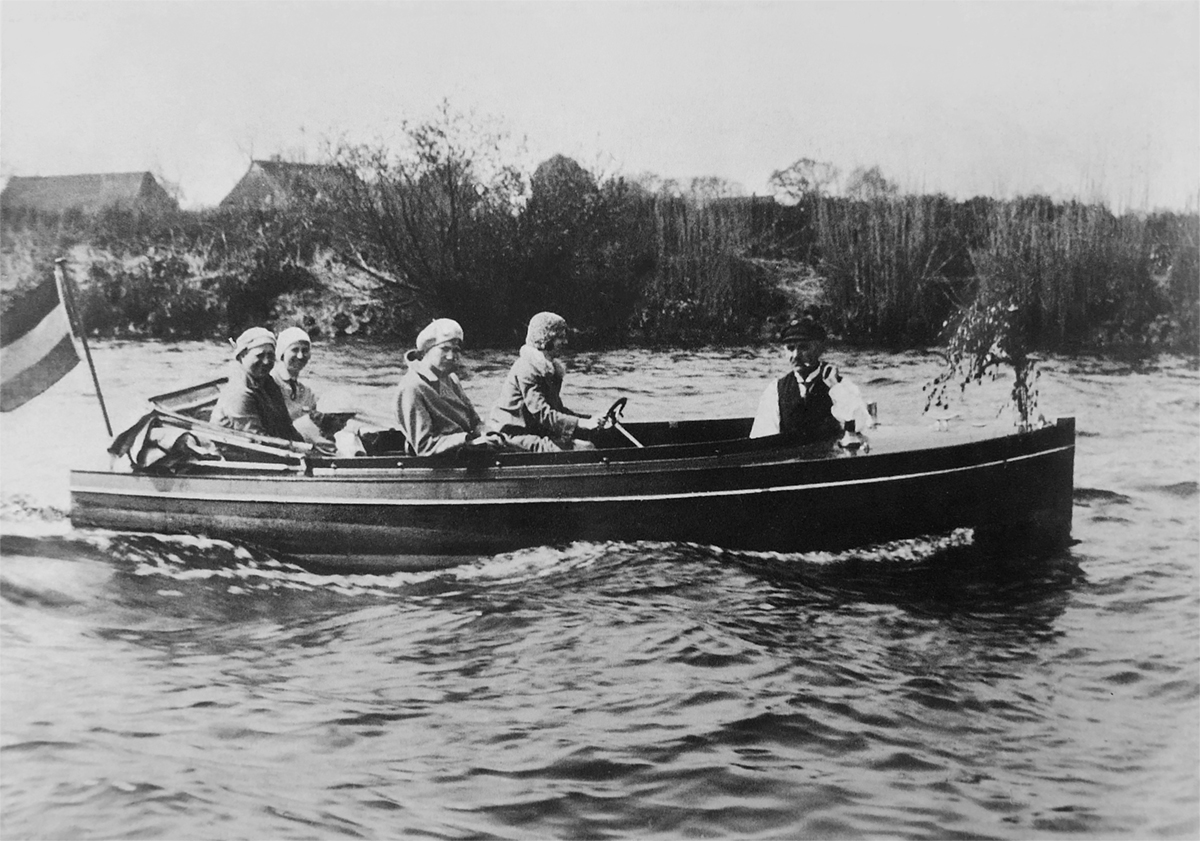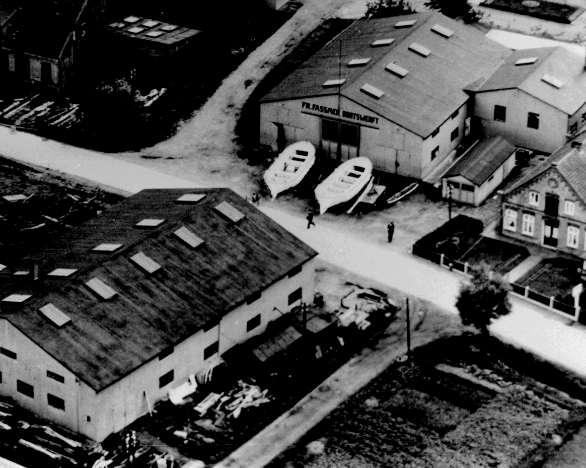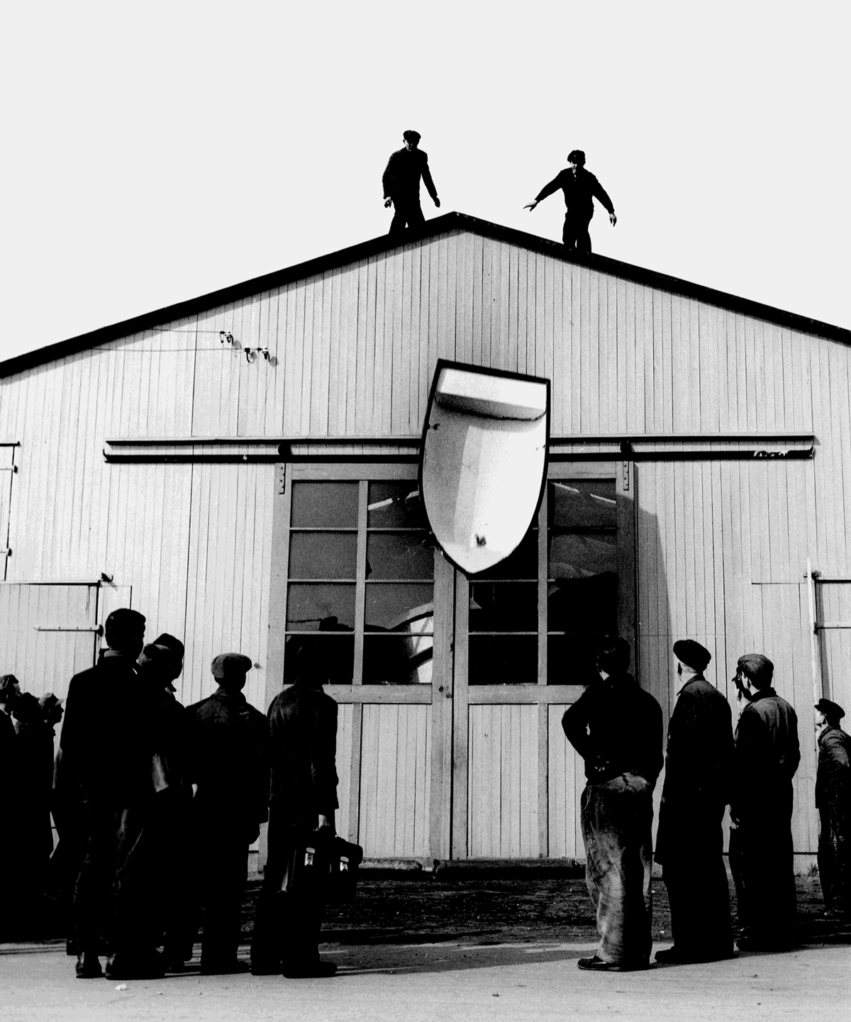 Fallversuch eine GFK-Ruderboots vom Dach des Bootsbauschuppen – 1958. Foto: Fassmer