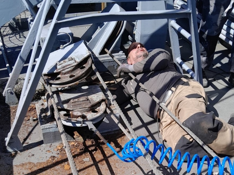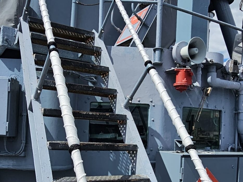 Besonders für die Arbeiten in luftiger Höhe waren mutige und schwindelfreie Kameraden gefordert. Und auch die nicht enden wollenden Handläufe am Niedergang vom Brückendeck zum ASROC-Deck, wurden mit viel Liebe zum Detail und in geduldiger Handarbeit neu betakelt. Selbst eine am ersten Tag durchgeführte Trauung an Bord konnte den Zeitplan nicht sprengen und brachte die Crew nicht aus der Ruhe. Lautstarkes Rostklopfen wurde eben um den Zeitraum der Trauung verschoben.